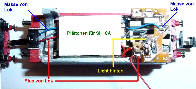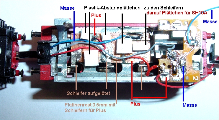 Der Sh10A ist aufgeklebt und die 4 Susilitzen mit dem kopfüber aufgelegten DH10C verlötet. Der DH10C braucht nur eine Verbindung zu Schiene