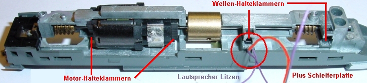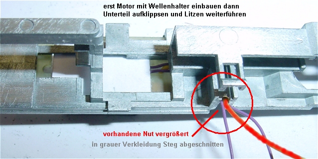 Der Motor muss nun eingebaut werden bevor die Litzen weiter verlegt werden, denn diese führen über die mittlere Wellenklammer die natürlich