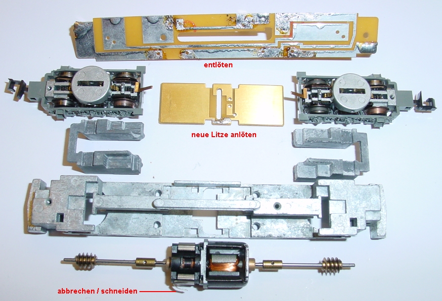 Lok zerlegt. Bearbeitet werden 1.) die Platine oben, 2.) Platine unten, 3.) Drehgestelle Stromabnahme,