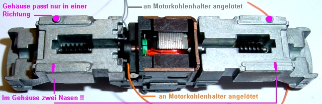 Motorlitzen vorne an den Kohlehaltern angelötet. Lila die erwähnten Pins. Die lila Striche unten deuten an wo im Gehäuse die Nasen sind.