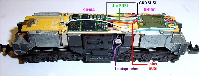 DH10C kopfüber, und Soundbaustein SH10A sind mit Doppelklebeband aufgeklebt. Susilitzen schwarz, grau, blau, rot sind verlötet. Orange vom