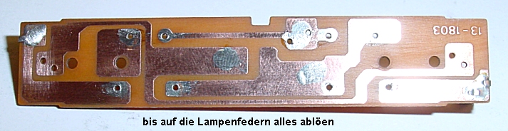 Das grüne und rot Kabel wird abgelötet. Die Platine zur Bearbeitung abgeschraubt und bis auf die Lampenfedern alles abgelötet.