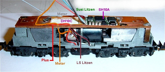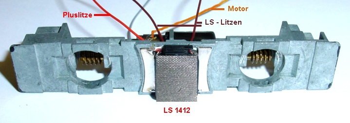 Drehgestelle etc. sind wieder eingebaut. Man sieht die 5 Litzen, grau und orange vom Motor sowie Plus rot und LS braun. Aus der Platine habe ich die