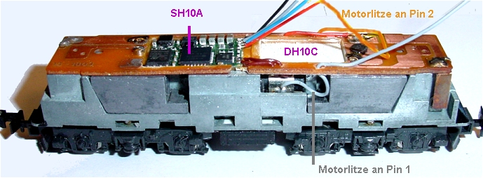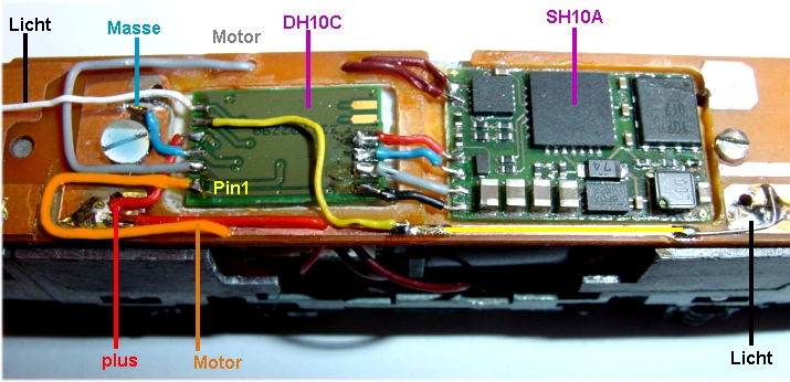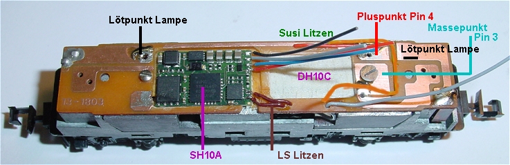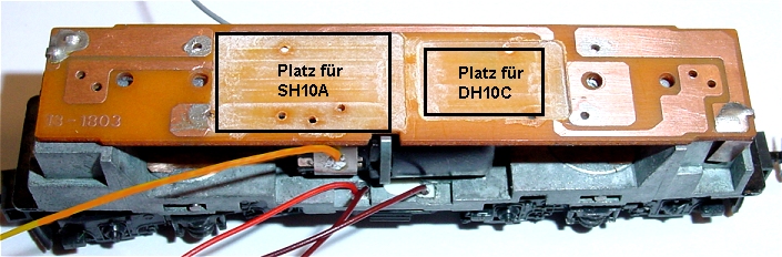 Nun ist auch der Multiprotokolldecoder DH10C eingeklebt und verdrahtet. Er liegt auf dem Rücken weil man besser löten kann und die Susilitzen
