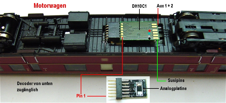 Der Steuerwagen muss einen eigenen Decoder bekommen. Hier kann man auch einen DH05C1 benutzen welcher statt der Analogplatine in die vorhandene