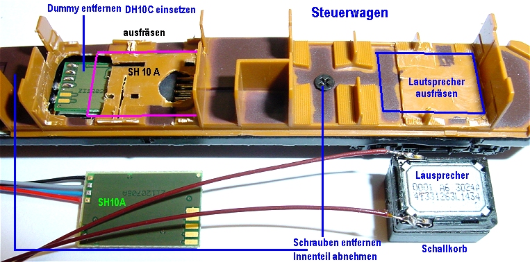 Umbauanleitung: hier mit 2 Stück DH10C1 Multiprotokolldecoder und 1 Stück SH10A Sounddecoder