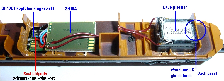 DH10C außen, dann grau, blau und rot innen angelötet. Es erfolgt eine Soundprobe wobei selbstverständlich beide Decoder, Motorwagen
