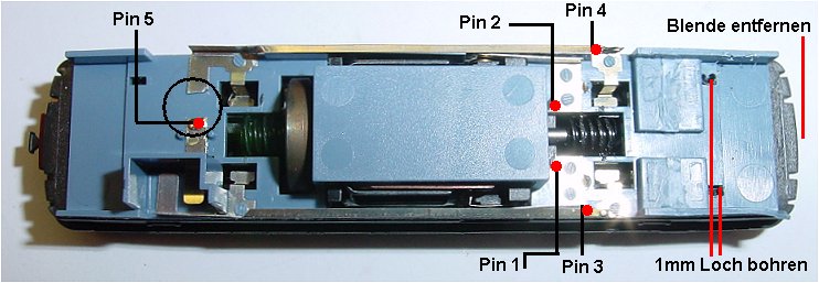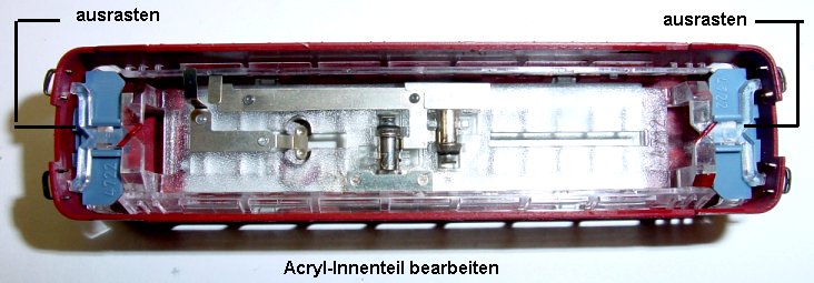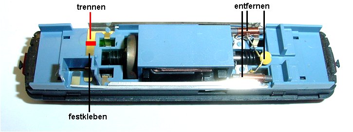 Im Motorwagen werden die beiden Drosseln und der Kondensator entfernt. Das Blech zu den Lampenfedern wird unterbrochen. Die Innenbeleuchtung