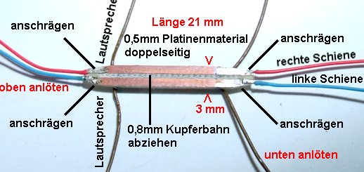 und dann erst verklebt wird ). Zwei Hilfslötplättchen sind eingeklebt, 1x Schiene rot / blau und 1x Lautsprecher braun auf einem Stück Walzblei.