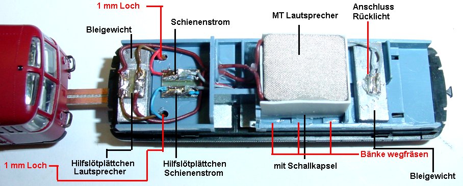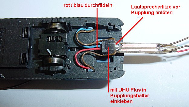 Decoders noch nach vorne verlegt werden können. An das Hilfslötplättchen wird Schiene rot und Schiene blau von vorne und vom Beiwagen gelötet.