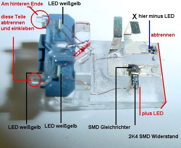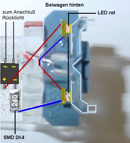 Steuerwagen ist. Im Beiwagen habe ich 2 rote LEDs über einen SMD Gleichrichter und SMD Vorwiderstand dauerhaft geschaltet. Wer das Schlusslicht