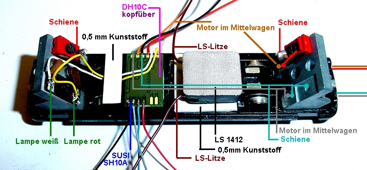 Der vordere Steuerwagen mit DH10C Decoder, SH10A Soundplatine und LS1412 Lautsprecher. in diesem Umbau wird für die Litzendurchführung