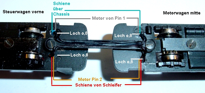 löten kann. Zum mittleren Motorwagen werden insgesamt 4 Litzen geführt. (Motor-Motor und Schiene-Schiene) Die beiden Schienenlitzen