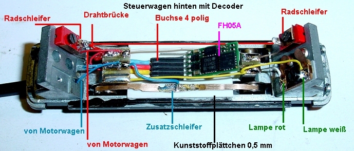 Der hintere Steuerwagen mit FH05A Schaltdekoder. Ich habe ihm eine Buchsenleiste spendiert weil ich befürchtet habe das sich