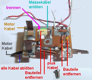 Bis auf die Motorfedern und Stromabnehmerfeder wird alles von der Platine abgelötet. Die Leiterbahn Masse / Motor muss