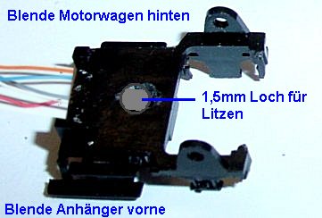 1,5 mm Loch gebohrt wo später die Litzen zwischen den Wagen durchgezogen werden. In die Unterseite vom Kupplungsschacht