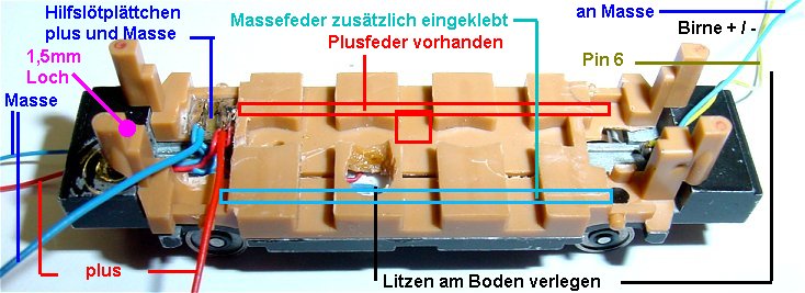 welche in der Vertiefung des Wagenbodens nach vorne verlegt wird. Im hinteren Lichtkasten wird die rote Birne mit zwei Kabeln
