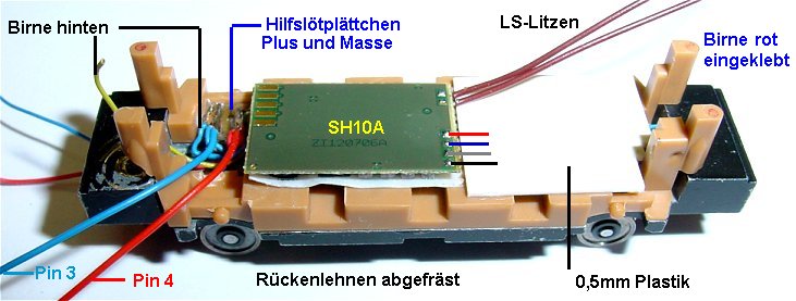 Kabel für Pin 3 und 4 des Decoders. An blau muss natürlich auch noch die Birne mit ihrer Masse. Der Soundbaustein wird