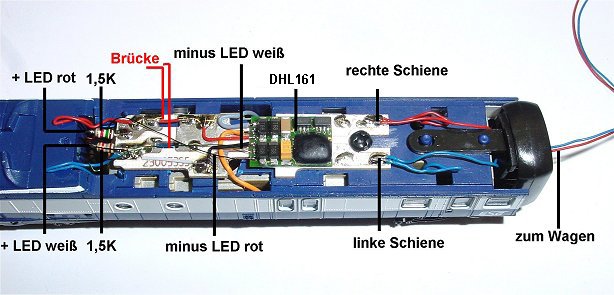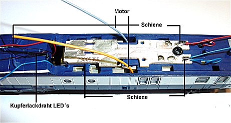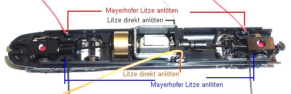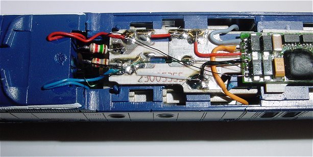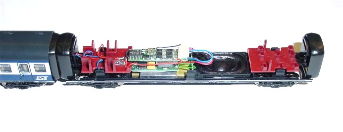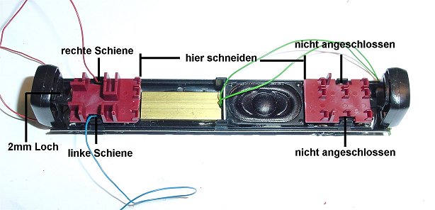 zum Decoder und einmal zum zweiten Wagen. In diesem Umbau sind die beiden Wagen noch durch die Litzen verbunden, in späterer Ausführung