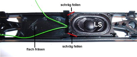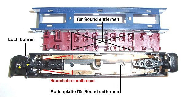 Aus dem roten Teil wird für den Sound das angegebene Stück herausgetrennt. Die Bodenballastplatte wird entfernt.